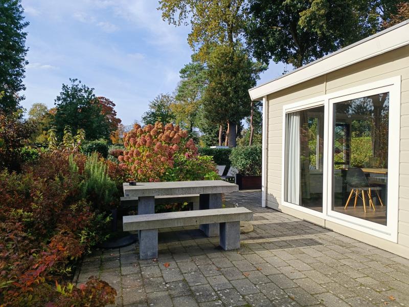 Een goed onderhouden, sfeervol, kleurrijk ingericht en heerlijk privé gelegen chalet afm: 12x 4m² op een ‘groen’ grondopp. van ca. 250m². In elk jaargetijde een feest om te verblijven!